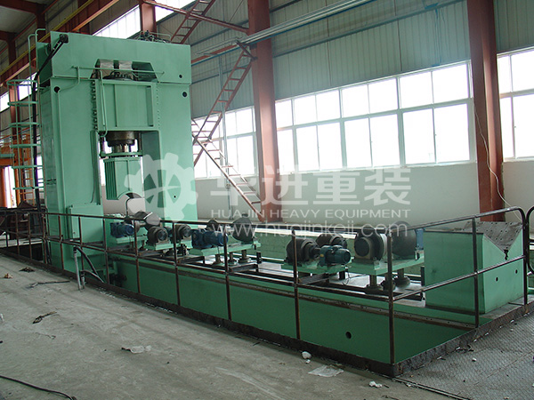 鋼管校直機(jī)主要用于鋼制圓柱形結(jié)構(gòu)管、輸油氣管的全長(zhǎng)壓力矯直,兼有管端局部修整壓圓功能,本機(jī)適用于專業(yè)化、流水線生產(chǎn)的鋼管制造企業(yè)。本機(jī)用作校直用的主壓頭是固定安裝在一個(gè)龍門式的框架上,龍門式框架可沿鋼管長(zhǎng)度方向移動(dòng)、工作位置定位鎖緊,無須移動(dòng)工件即可作多點(diǎn)校直,大大提高了工效;本機(jī)工作臺(tái)面上裝有3套可同步升降的旋轉(zhuǎn)輥道,可托起鋼管后,360°機(jī)動(dòng)旋轉(zhuǎn)并定位鋼管需被壓制校直的高點(diǎn),方便、可靠;本機(jī)在工作臺(tái)面上裝有6套可升降的縱向輸送輥道,為沿軸向輸入、輸出鋼管提供了方便;本機(jī)工作臺(tái)面上設(shè)有一對(duì)可改變位置的V型砧座,以適應(yīng)不同長(zhǎng)度鋼管的校直,并可用作鋼管管端局部修整壓圓的下支撐。